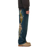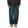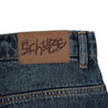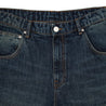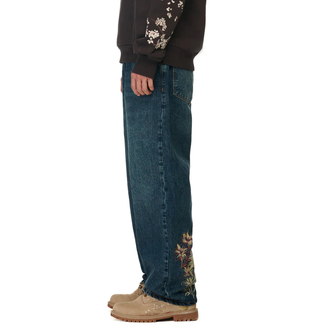 Denim brut 475 g / 100 % coton / Broderie dans le dos / Patch en cuir imprimé en relief / Effet délavé (lavage à l’envers) / Coupe droite / Taille conforme
