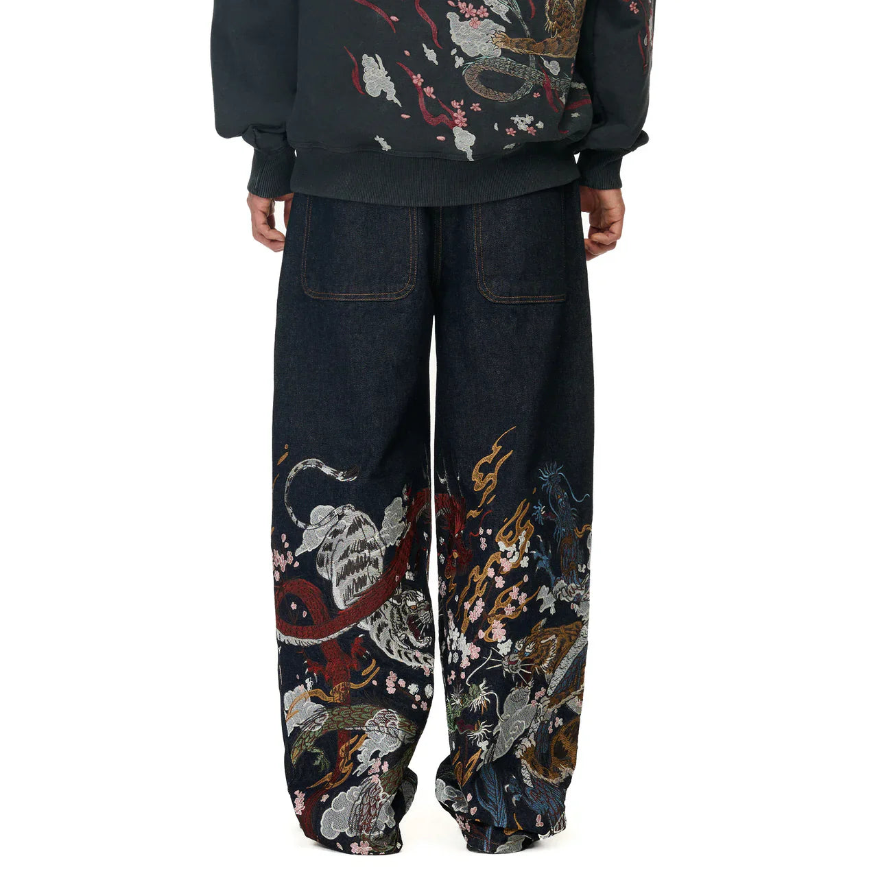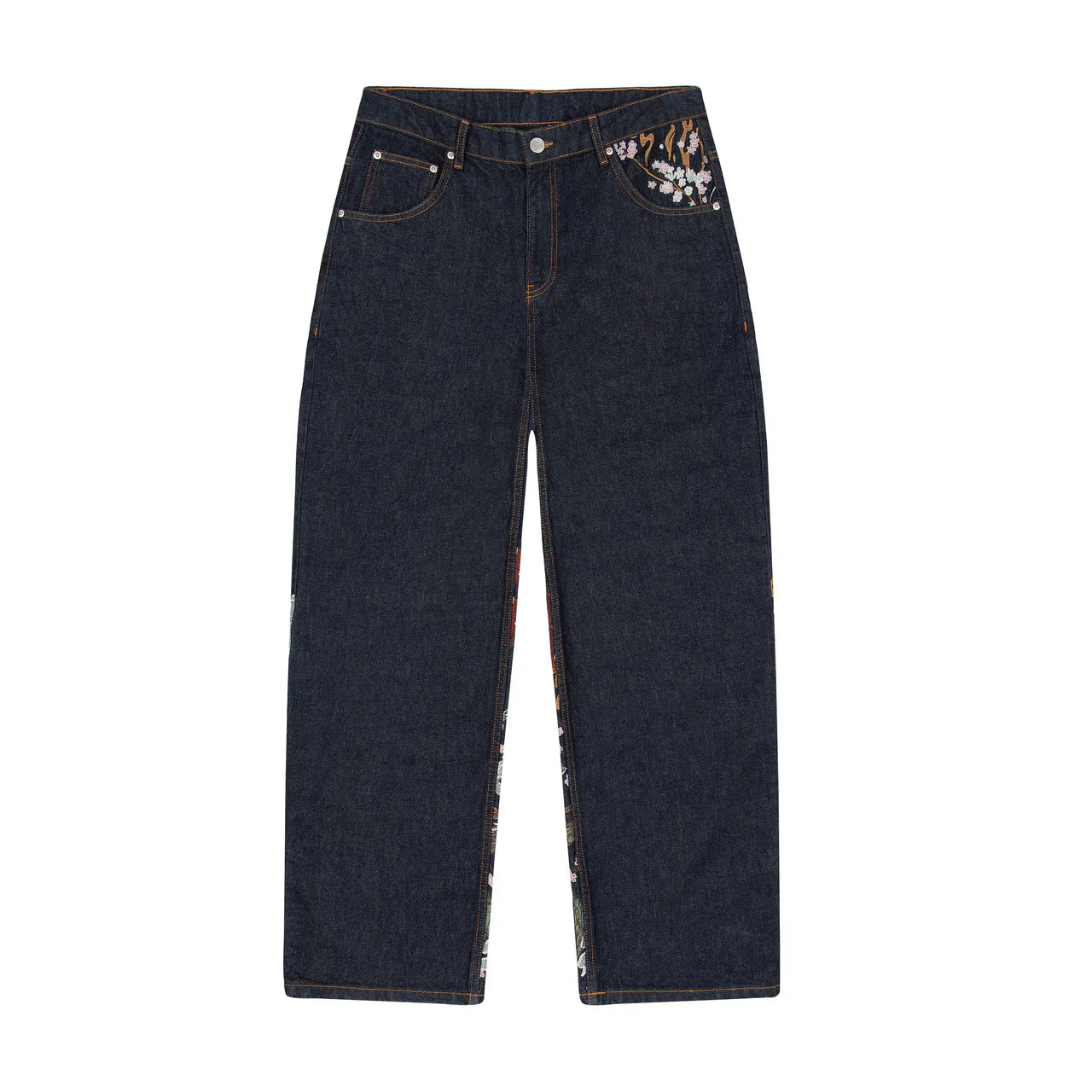 Denim brut 475 g / 100 % coton / Broderie au dos / Patch en cuir brodé / Lavage à l’envers / Coupe balloon / Taille conforme